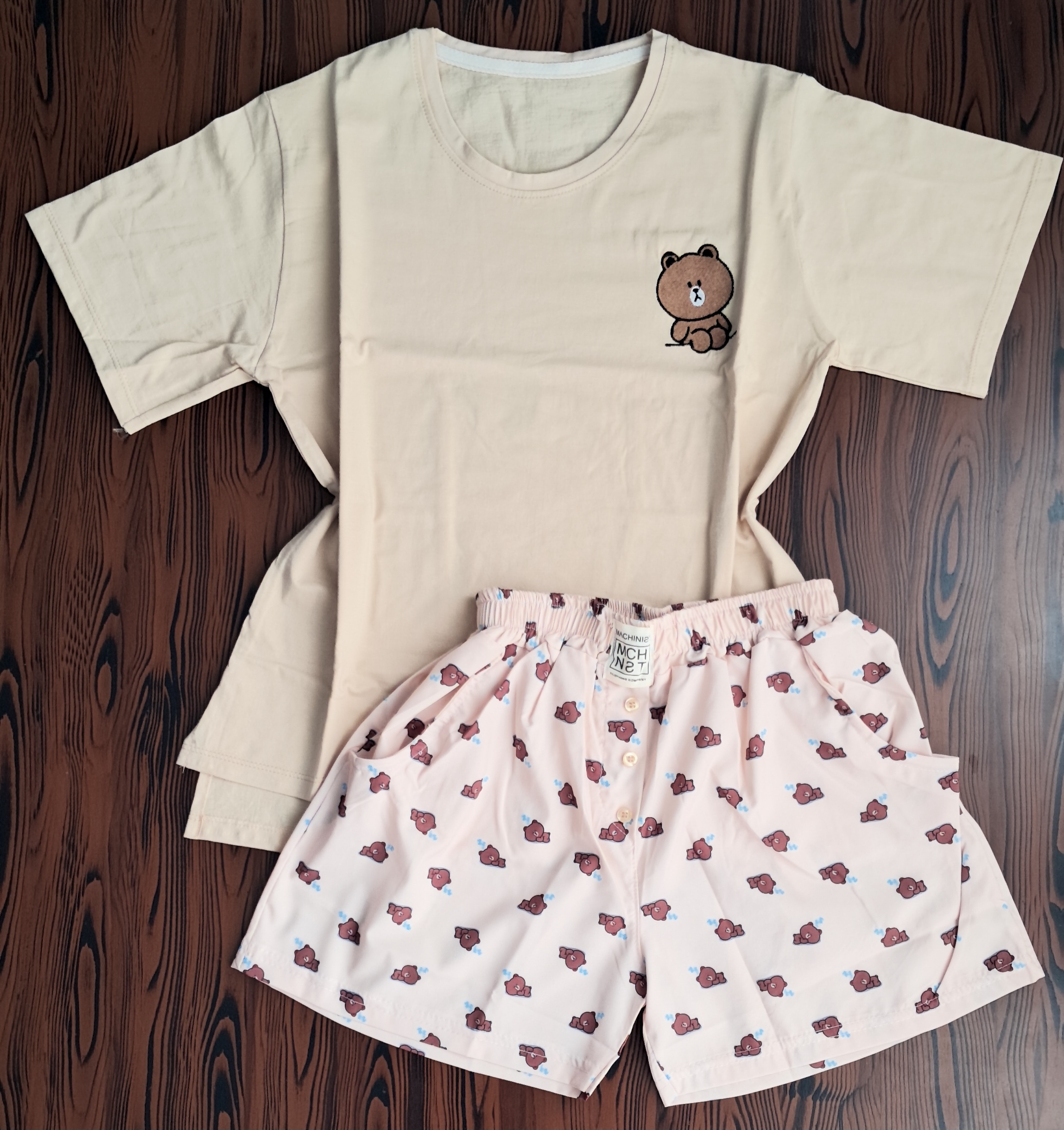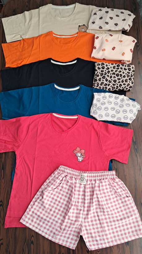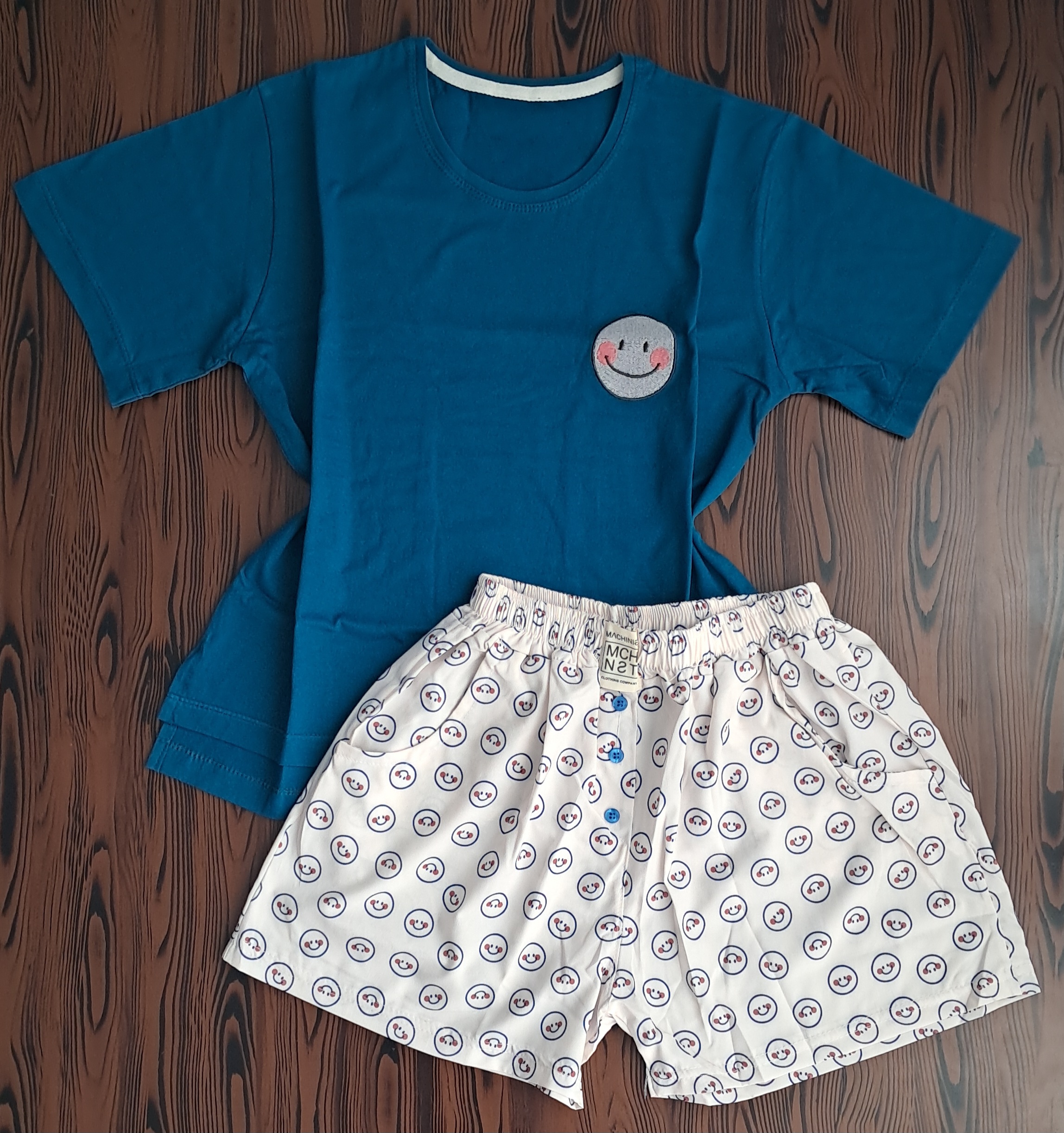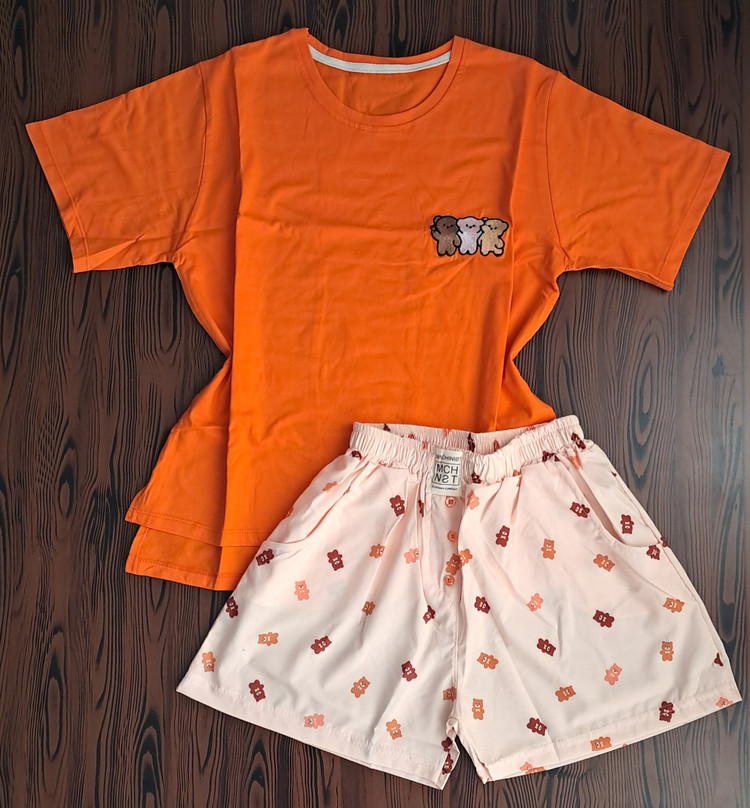 جزئیات: طرح روی تیشرت گلدوزی شده و بغل تیشرت چاک داره ، شورتک جیب داره و دکمه نماس